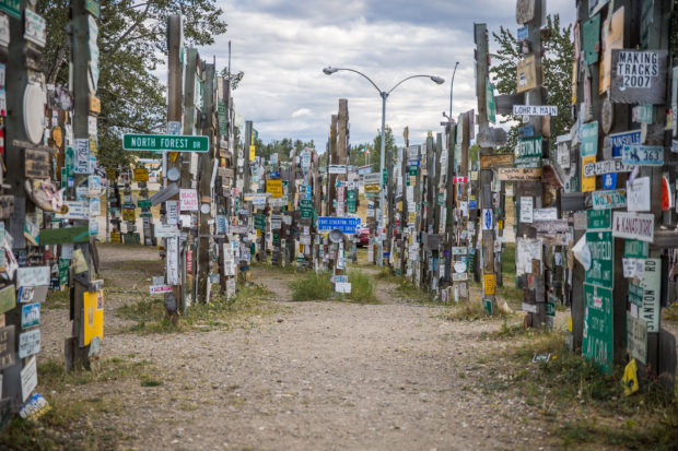 Une petite ville sur la route de l’ Alaska, réputée pour sa forêt de caractères. Les voyageurs ici ont des pancartes et des plaques d’immatriculation – il y en a plus de 70 000!