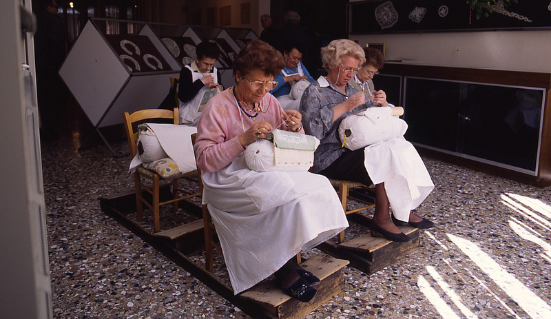 Sur la place principale de la Piazza Galuppi, se trouvent l’école et le musée de la dentelle (Scuola et Museo del Merletto). Vous pouvez y voir divers exemples de points de suture, des dessins et plusieurs applications de la dentelle dans les vêtements. Nous avons eu la chance de nous retrouver au milieu de 6 femmes qui parlant fort, tricotaient de la nouvelle dentelle.