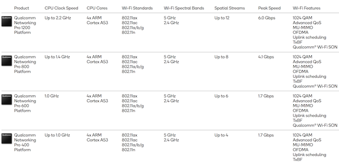 L’autre innovation présentée lors du Wi-Fi 6 Day est la gamme Qualcomm Networking Pro Series, la deuxième génération de jeux de puces réseau Qualcomm Wi-Fi 6 optimisés pour les environnements à fort trafic. Il s’agit d’un portefeuille complet de plates-formes Wi-Fi 6 divisées en 4 bandes: séries 400 , séries 600 , séries 800 et au sommet de Qualcomm Networking Pro série 1200 où les chiffres précédant le double zéro représentent le nombre de flux spatiaux pris en charge, de 4 à 12 À mesure que le flux spatial augmente, la vitesse des 4 cœurs ARM Cortex A53 augmente également, passant de 1 GHz minimum à un maximum de 2,2 GHz.