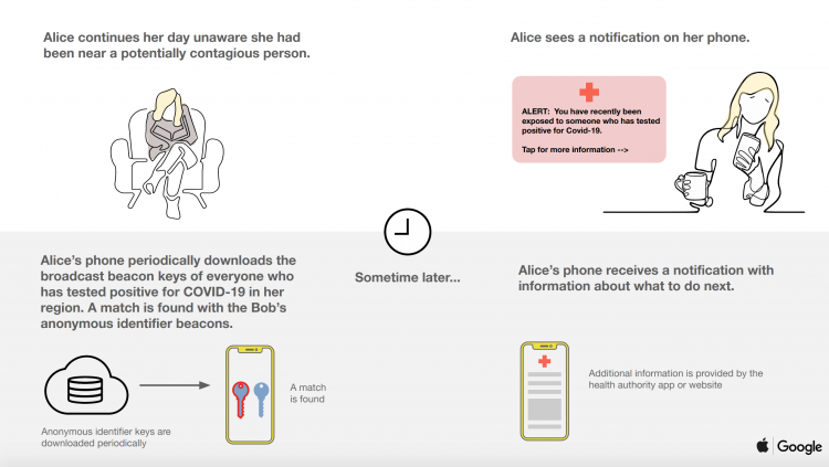 Chaque jour, votre iPhone récupère les identifiants des personnes testées positives pour COVID-19 dans votre région. Si l’un de ces codes correspond aux identifiants qui se trouvent sur votre iPhone depuis 14 jours, il est connu que vous avez rencontré une personne infectée. Vous serez averti via une notification d’application, indiquant quoi faire.
