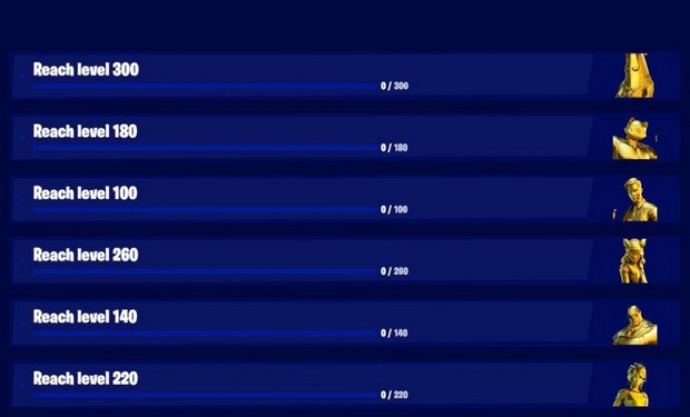 Voici une image pratique, qui vous montre comment obtenir tous les skins d’or de Fortnite 2 Saison 2. Les niveaux à atteindre seront respectivement de 100, 140, 180, 220, 260 et 300.