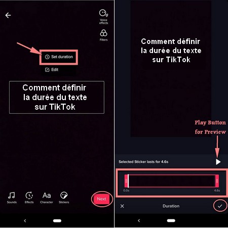 Et le timing? Comment définir la durée du texte sur TikTok à différents moments? Vous ne pouvez définir la durée du texte qu’après avoir appuyé sur « Terminé » dans le coin supérieur droit de l’écran.Pour mettre des mots sur la vidéo TikTok à différents moments, vous devez ajuster la synchronisation du texte sur votre vidéo. Appuyez simplement sur votre texte et sélectionnez « Définir la durée« .