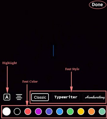 - Modifier le texte (personnaliser la couleur, la taille et le timing) : Voici maintenant quelques options d’édition de texte de base disponibles pour vous: # L’icône « A » sur le côté gauche de l’écran vous permet d’ajouter une surbrillance au texte. # Il existe de nombreuses polices disponibles qui vous aideront à donner un look élégant à votre légende TikTok.# Les cercles colorés en bas de l’écran sont là pour vous permettre de changer la couleur du texte.