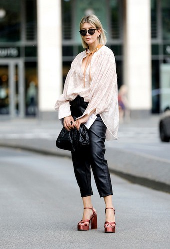 Cuir avec cuir: un pantalon noir est le complément parfait de la pochette tissée Bottega Veneta. La touche de couleur qu’il faut est ajoutée par les chaussures.