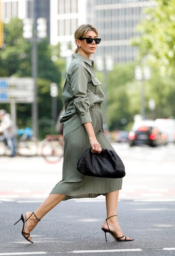 Accessoires noirs sur un look vert militaire: la pochette de Bottega Veneta est l’élément chic qui complète le look.