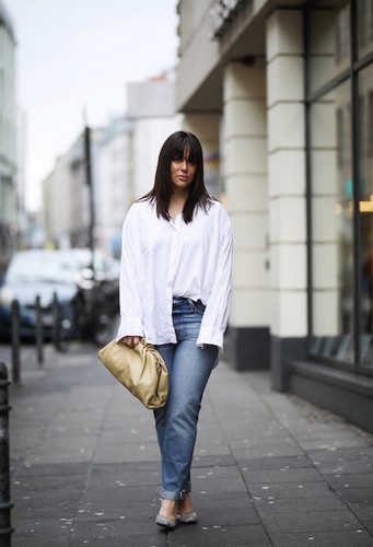 Jeans, chemise blanche, chaussure à paillettes et sac à main: la tenue parfaite pour un vendredi soir facile!