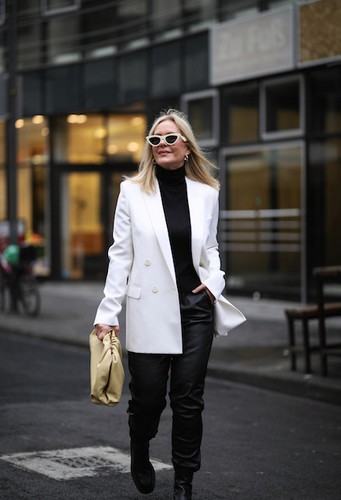 Blazer blanc sur look noir et pochette couleur champagne: super chic!