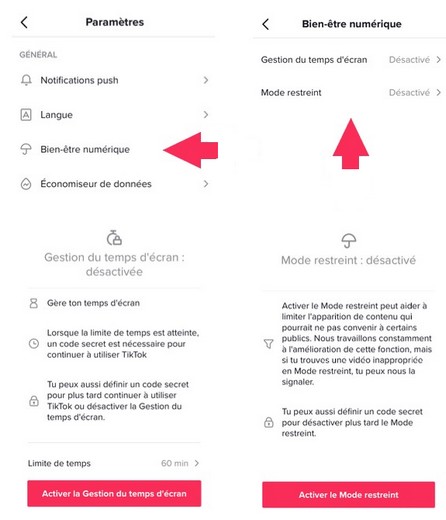 Vous pouvez limiter le temps d’utilisation de TikTok. Pour ce faire, activez la «Gestion du temps». Avec cela, vous définissez un temps maximum par jour. Vous pouvez définir ce maximum sur 40, 60, 90 ou 120 minutes. Le temps est-il passé? Votre enfant ne pourra alors plus utiliser l’application.