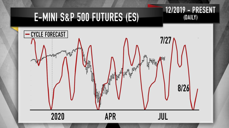 “Les graphiques, tels qu’interprétés par Larry Williams, suggèrent que le S&P pourrait grimper encore de 4% ou 5% au cours des deux prochaines semaines, mais le 28 juillet, il s’attend à ce que le marché commence à se renverser”, a déclaré Cramer.