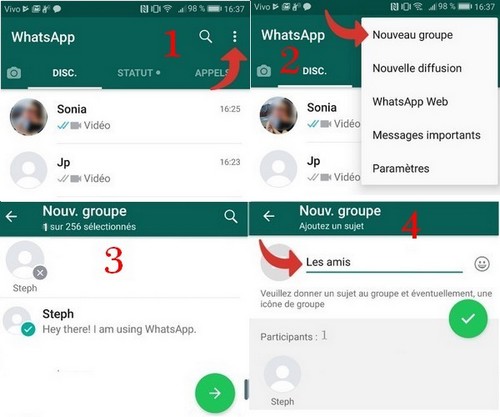 - Ouvrez WhatsApp, cliquez sur le symbole à trois points (zone supérieure droite) et appuyez sur » Nouveau groupe « .