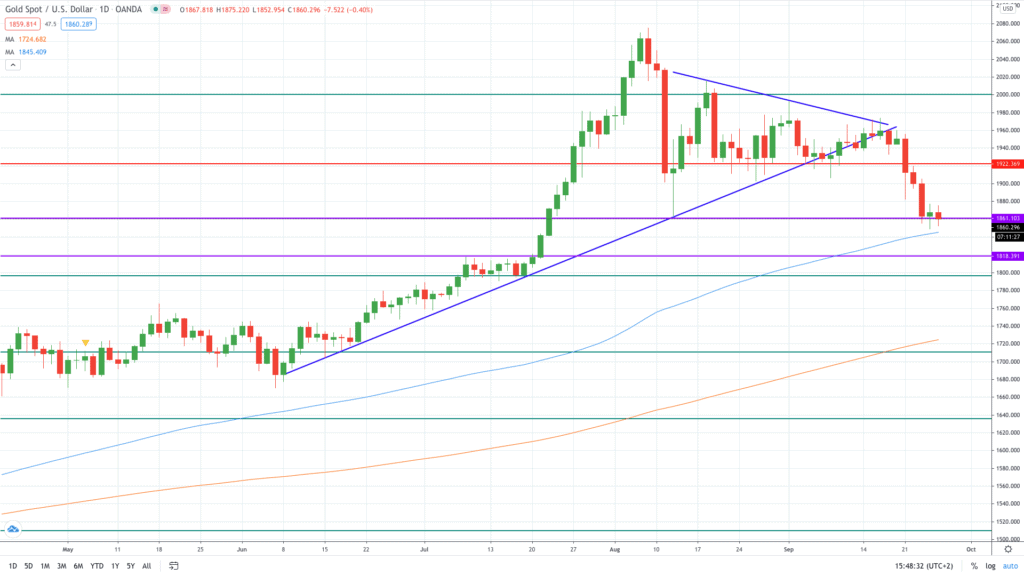 Les prix de l’or (XAU / USD) ont chuté au plus bas niveau enregistré depuis juillet alors que le dollar américain gagne en raison des inquiétudes croissantes concernant les nouveaux cas de Covid-19 en Europe et des doutes émergents sur les mesures de relance supplémentaires de la Fed aux États-Unis.