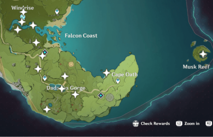 Remarque – Cette zone n’est accessible qu’après avoir terminé la partie 3 du prologue. Pour obtenir l’Anémocolus du Nord-Est, utilisez simplement les montagnes voisines pour atteindre un point plus élevé et glissez simplement vers l’Anémocule.