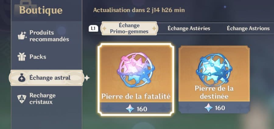 Il est également possible d’en récupérer en les échangeant contre des Astéries et/ou des Astrions. Il s’agit de deux ressources que vous obtenez en supplément à chaque fois que vous faites des vœux.