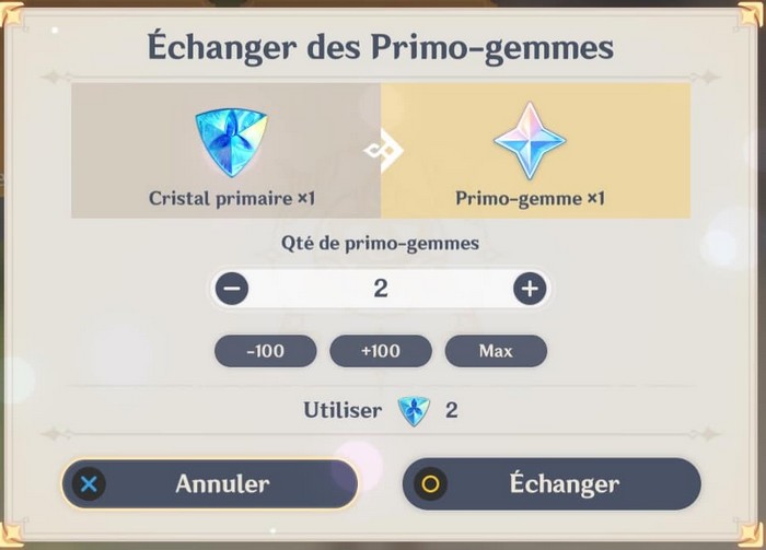 - Les cristaux primaires : Vous pouvez acheter avec de l’agent réel des cristaux primaires pour les échanger par des primo-gemmes.