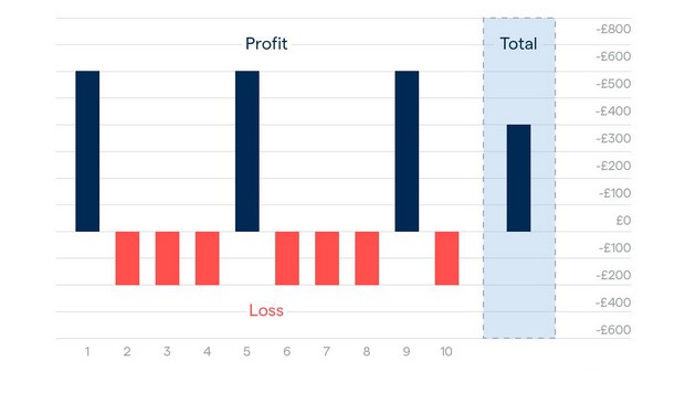 Pour trouver le ratio, comparez le montant d’argent que vous risquez sur un échange FX au gain potentiel. Par exemple, si la perte potentielle maximale (risque) sur une transaction est de 200 £ et le gain potentiel maximum est de 600 £, le rapport risque-récompense est de 1: 3. Donc, si vous avez placé dix métiers en utilisant ce ratio et que vous avez réussi sur trois d’entre eux seulement, vous auriez gagné 400 £, même si vous n’aviez raison que 30% du temps.
