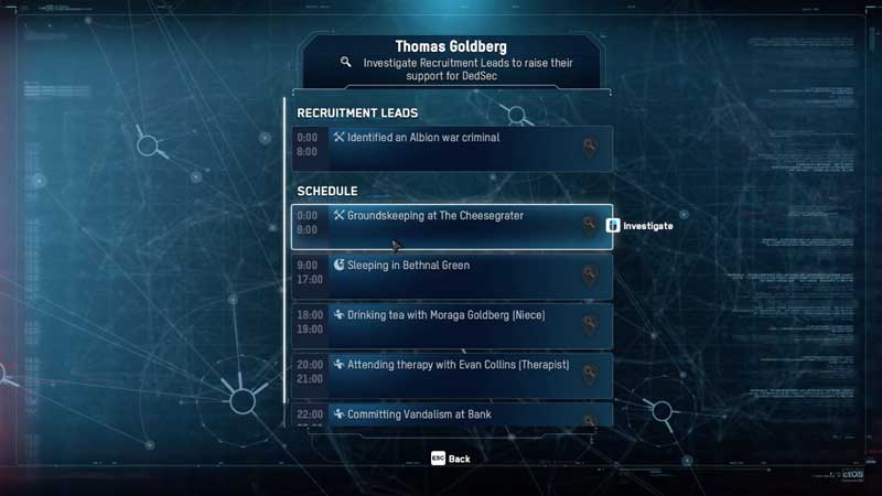 Deep Profiler place devant vous le calendrier complet d’un PNJ. Il vous aidera ensuite dans les missions que vous devez choisir pour recruter ce PNJ particulier. Ces missions peuvent être aussi simples ou complexes, mais elles mènent toutes à gagner la confiance du PNJ. Cela vous aidera ensuite à parler au PNJ et à lui demander de rejoindre DedSec.