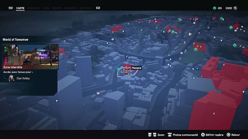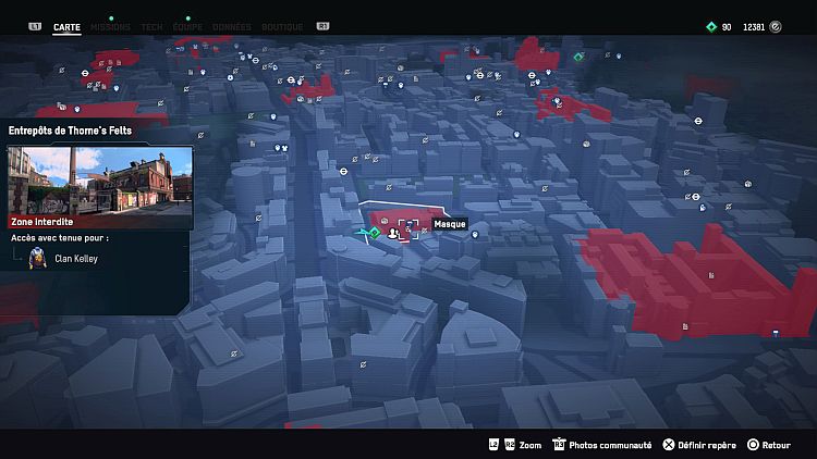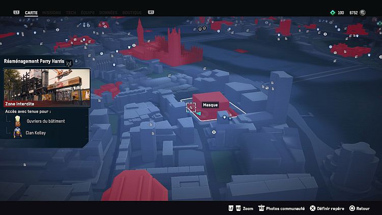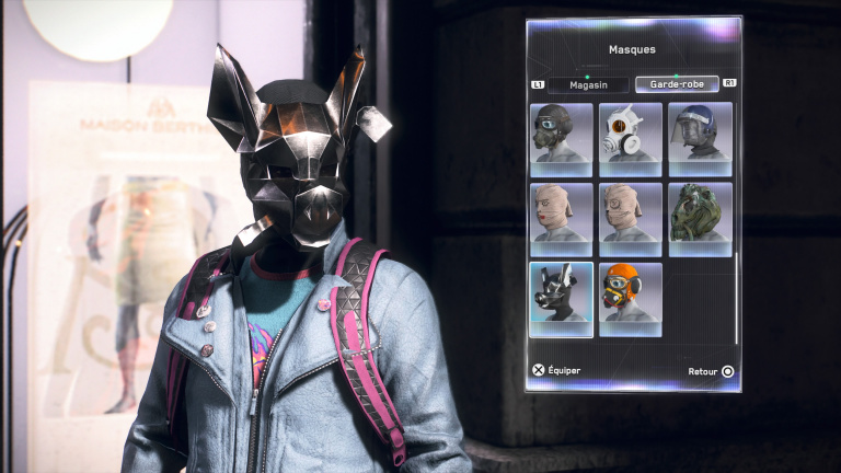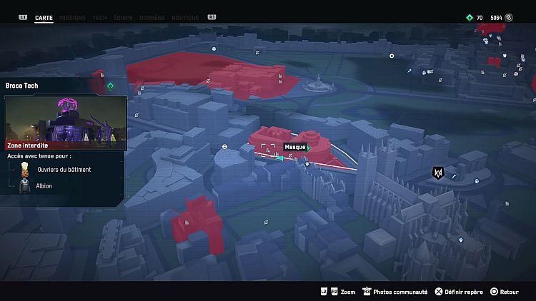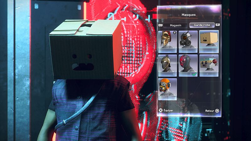 Au sud-ouest du siège social de DedSec, il y a une zone restreinte appelée Broca Tech. Le masque est entre le bâtiment sur le toit. Appelez un drone Cargo et volez vers le toit, allez à l’emplacement marqué et vous apercevrez la boîte à masque.
