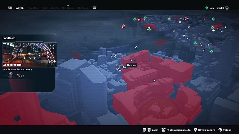 FoodTown est une zone restreinte. Le masque est situé dans un bureau verrouillé, si vous n’avez pas la clé d’accès, vous pouvez utiliser le robot araignée et accéder au masque via l’évent. Sur la gauche du panneau FoodTown, il y a un évent dans le coin droit. Vous pouvez ramper à travers cela pour entrer dans le bureau et attraper le masque.