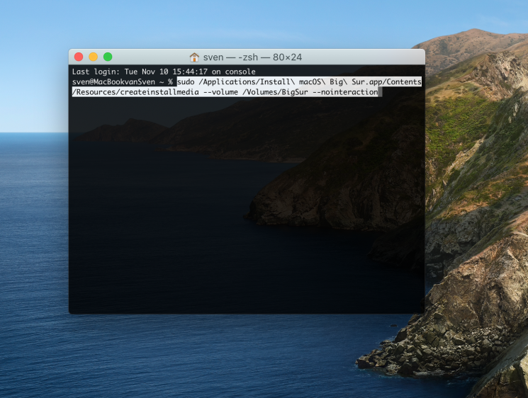 sudo /Applications/Install\ macOS\ Big\ Sur.app/Contents/Resources/createinstallmedia --volume /Volumes/BigSur --nointeraction- Appuyez sur Entrée et entrez votre mot de passe. Vous ne verrez pas ce mot de passe, mais continuez à taper et appuyez sur Entrée.