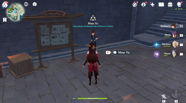 Mme Yu se trouve dans le Port de Liyue, derrière la Guilde des Aventuriers.