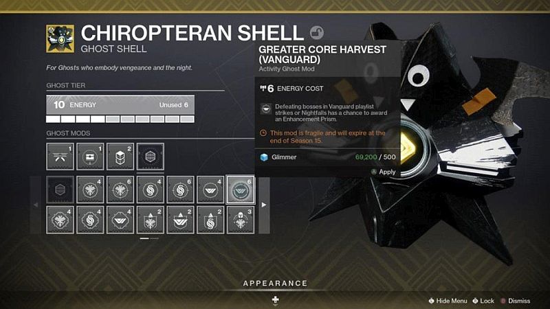 Viennent ensuite les emplacements d’armure. Ceux-ci sont améliorés de la même manière que vous maîtrisez une arme, dans le cas d’une armure, vous obtenez une défense supplémentaire contre certains dégâts élémentaires respectivement Void, Arc et Solar. Contrairement aux armes, des améliorations plus avancées nécessitent des prismes d’amélioration et des fragments ascendants. Obtenez autant d’emplacements d’armure que possible car vous en aurez besoin pour les mods. Fondamentalement, ce sont des avantages personnalisables. Ils peuvent aller de vous donner un contrôle supplémentaire sur un certain type d’arme à l’accélération du temps de recharge des capacités lorsque vous effectuez une certaine action. Chaque mod a un coût en énergie, et s’il dépasse le nombre d’emplacements que vous avez sur cette pièce d’armure, il ne peut pas être équipé.