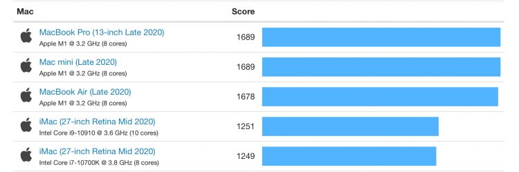 Les derniers scores Geekbench montrent que le Mac mini avec la puce M1 est plus rapide dans les tests monocœur que tous les Mac précédents. Les nouveaux MacBook Pro et Mac mini se partagent la première place avec 1689 points. Le MacBook Air prend la troisième place et fait 1678 points.