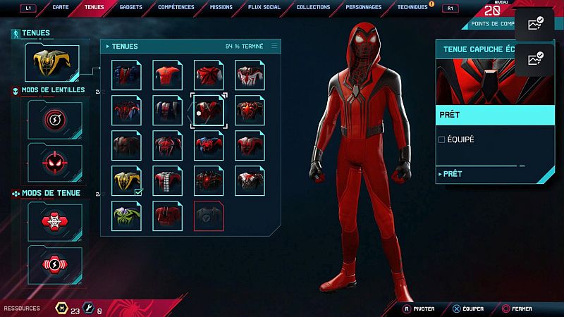 - Costume de la capuche écarlate : nécessite le niveau 9, 14 jetons d’activité et 2 pièces high-tech. Les éliminations des attaques Web ne peuvent pas être entendues par les ennemis.