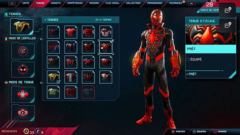 - Tenue S.T.R.I.K.E. : nécessite le niveau 10, 16 jetons d’activité et 2 pièces high-tech. La jauge de venin se charge à mesure que la santé diminue.