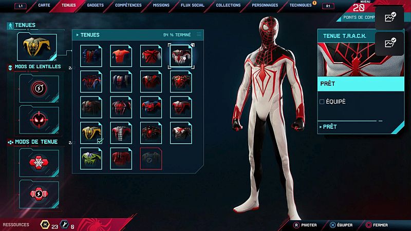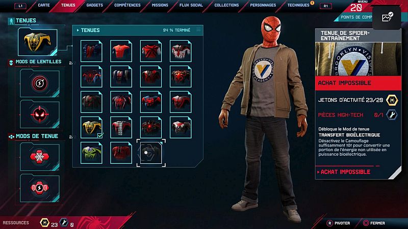 - Tenue de Spider-entraînement : obtenu dans le New Game + (mode Nouvelle partie +). Nécessite 20 jetons d’activité et 1 pièce high-tech. La dissimulation peut être convertie en énergie de venin.
