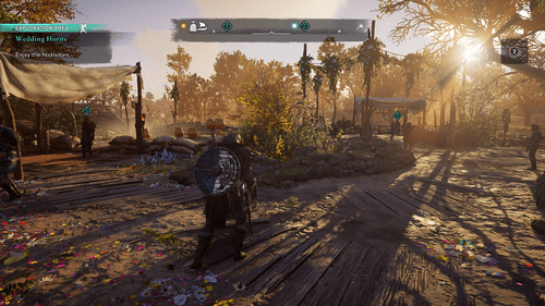 Après la cinématique, vous devrez participer à des festivités de mariage. Faites ce que vous voulez ici – cela n’affecte rien de ce qui se passe ensuite. Vous ne faites que tuer le temps jusqu’à ce que quelque chose se passe. Faites le tour de chaque marqueur d’objectif pour atteindre cet objectif. Nous avons terminé un défi d’arc, qui nous a valu 50 médailles d’argent à la fin, puis nous avons fait un concours de boisson.