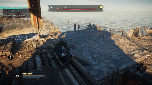 Après vous être rendu à Oswald, vous serez chargé de trouver et de vaincre l’un des éclaireurs de Rued. Il y en a trois dans la banlieue d’East Anglia – il vous suffit d’en affronter un, alors montez sur le bateau voisin au bout du quai et dirigez-vous vers le marqueur d’objectif le plus proche.
