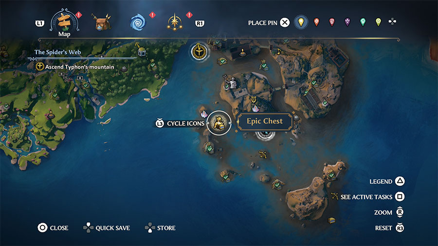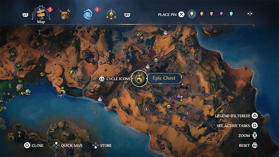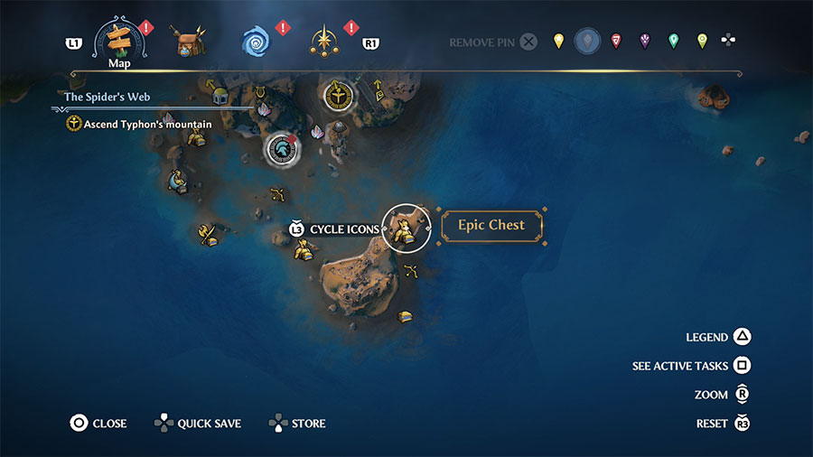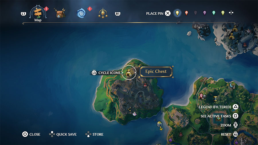 L’entrée se trouve près du pied de la falaise. Il y a un puzzle ici. Là où je me tiens, il y a un brasero allumé juste en face de l’entrée du coffre. Vous devez allumer les torches pour qu’elles correspondent au motif du casque de spartiate. Ainsi, par exemple, c’est celle de devant, celle de droite, et celle de derrière et au-dessus. Tous les casques orientés vers la droite représentent les braseros qui doivent être allumés.