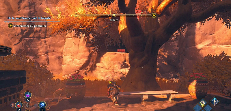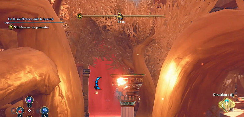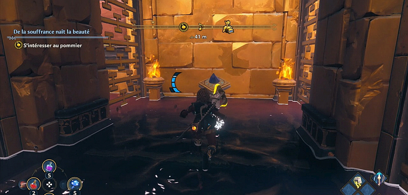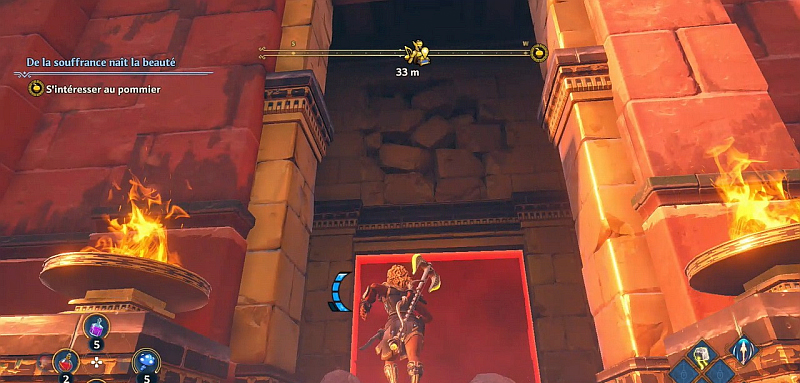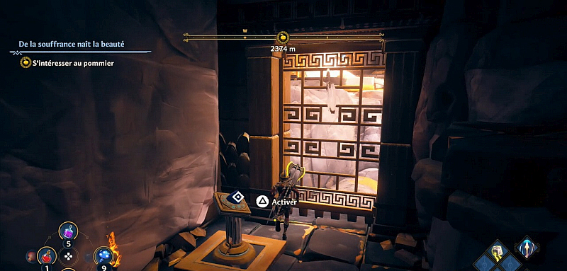 Le quatrième interrupteur à cristal se trouve sur la face sud-ouest du bâtiment et nécessite d’allumer une torche au sommet d’un arbre voisin. Pour l’allumer, dirigez-vous à l’intérieur de la grotte dans la falaise voisine et montez les marches sur le côté de la structure et passez par le trou dans le toit. Sur la gauche se trouve un bloc de métal derrière une grille: utilisez la force d’Héraclès pour le déplacer sur la plaque de pression, activant une torche allumée. Utilisez une flèche d’Apollon pour allumer la torche dans l’arbre et abaisser la barrière!
