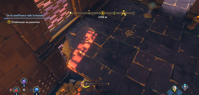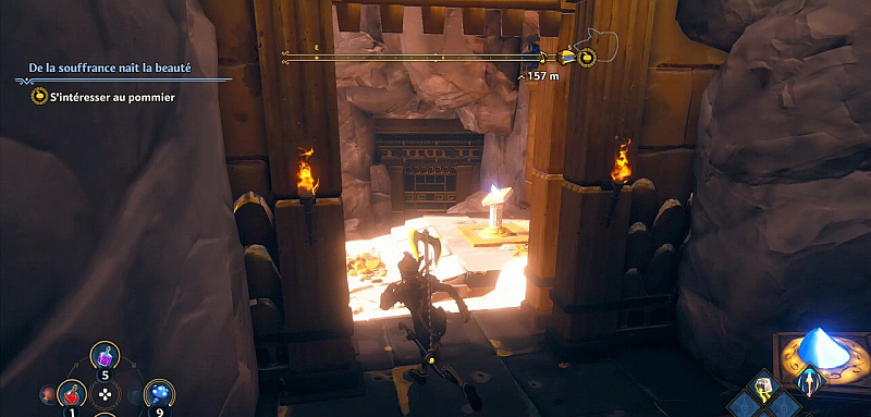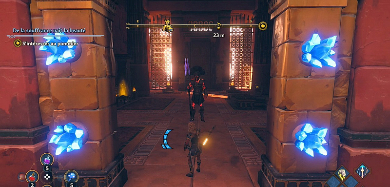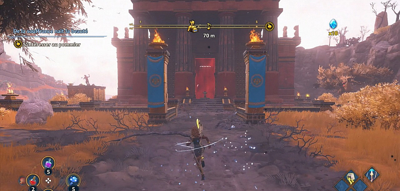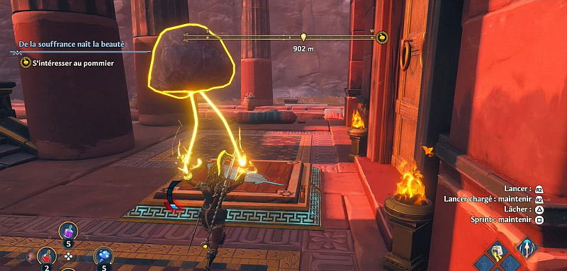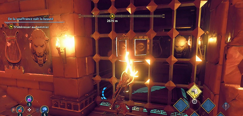 Le second est du côté Nord-Est dans la pièce avec une barrière. Grimpez au-dessus de la porte et utilisez une arme lourde sur le mur fissuré et révélez une cible fléchée derrière une grille. Montez sur le piédestal de la statue à proximité et envoyez une flèche d’Apollon à travers la grille pour toucher la cible et abaisser la barrière vers l’interrupteur en cristal.