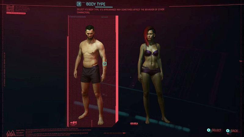 Cette section n’inclut aucun des choix esthétiques qui jouent sur l’apparence et la personnalité de V. Cependant, selon les menus du jeu, le type de corps que vous choisissez peut avoir un effet direct sur la façon dont les autres personnages voient et réagissent à V.