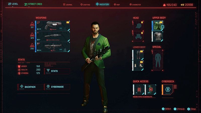 Vous pourrez également choisir le matériel cyber de base avec lequel vous commencez. Certains des premiers matériel cyber semblent n’être que des choix esthétiques, bien que davantage de personnalisation devienne disponible plus tard dans le jeu dans des endroits comme le Charcudoc. Cela ne veut pas dire que le système de création fait défaut, au contraire, les choix sont présents dès le départ pour aboutir à des perméations presque illimitées.