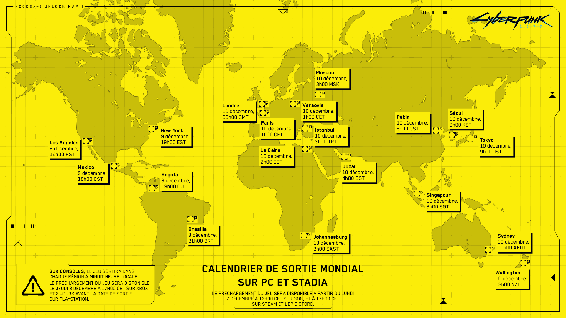 Les propriétaires de PS4 pourront toutefois précharger le téléchargement Cyberpunk 2077 à partir du mardi 8 décembre aux heures suivantes: