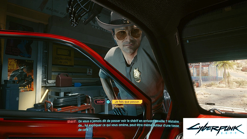 Mike dit à V que la pièce dont il a besoin n’est pas en stock, ce à quoi V rechigne et tente de réparer le véhicule lui-même. En faisant cela, ils sont tous deux interrompus par le Shérif local, qui informe V qu’il aurait dû lui faire savoir sa présence en ville.