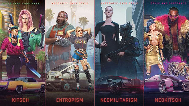 L’identité de l’univers Cyberpunk 2077 est composée de quatre époques et styles visuels distincts: l’entropism, le kitsch, le néo-militarisme et le néo-kitsch . Chacun avec sa propre histoire, son statut et ses fonctionnalités.