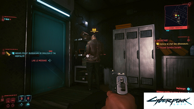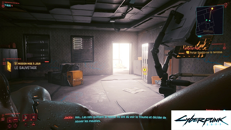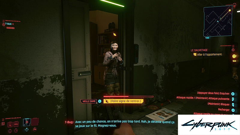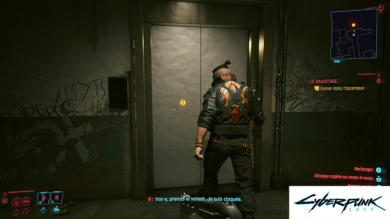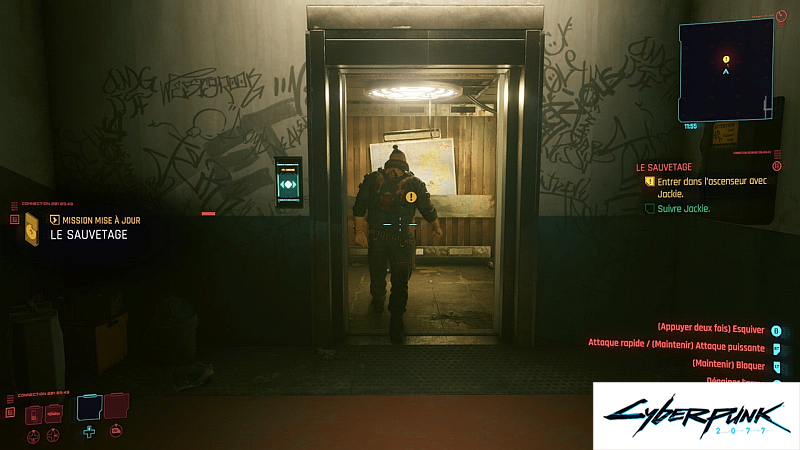 Suivre Jackie → Entrer dans l’ascenseur avec Jackie → Parler à T-Bug → Suivre Jackie → Aller à l’appartement