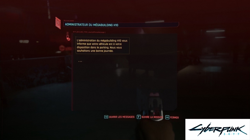 Durant la mission » Playing for time « , vous aller recevoir un message de l’administrateur du Megabuilding H10 pour vous informer que votre véhicule est à votre disposition dans le parking.