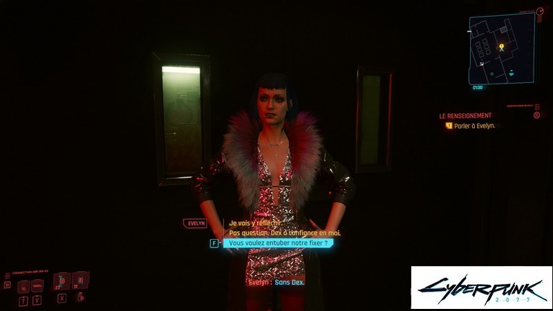 C’est là que le premier choix entre en jeu. Evelyn vous prend à part après la Danse Sensorielle et évoque qu’elle veut retirer Dex de l’affaire. Offrant la moitié des gains, votre équipe et Evelyn pourraient utiliser cet argent pour faire tout ce que vous voulez. Bien que trahir Dex soit risqué, il existe de nombreux autres réparateurs en ville qui vous feraient de même. À ce moment-là, vous avez la possibilité de dire «Je vais y réfléchir» ou «Pas question, Dex a confiance en moi».