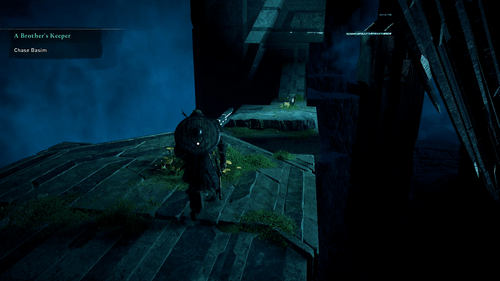 Poursuivez Basim, grimpant sur les piliers de pierre et tel qu’il grimpe. Suivez-le simplement sur le chemin vers l’avant, glissez sous des ouvertures sur lesquelles vous ne pouvez pas sauter et sautez par-dessus les espaces et sur les poutres si nécessaire.