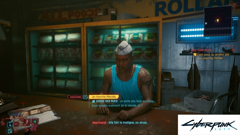 Aller à la boucherie → Faire savoir au vendeur que vous cherchez Placide → Regarder en direction de la caméra