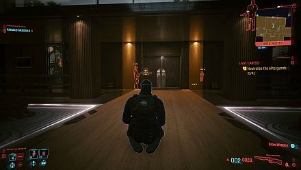 Avec le garde de la piscine pris en charge, continuez à travers les doubles portes et sortez le garde d’élite à genoux près de l’entrée principale.