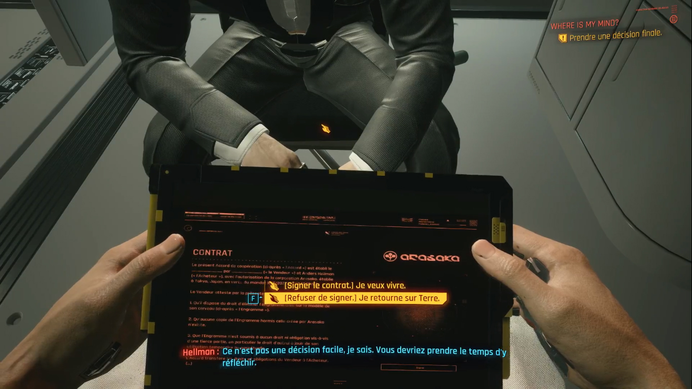 Bien que significatif du point de vue du personnage, ce choix est entièrement personnel car il ne changera essentiellement que la cinématique finale que vous recevrez peu de temps après, qui montrera soit V abandonner son esprit, soit retourner sur Terre.