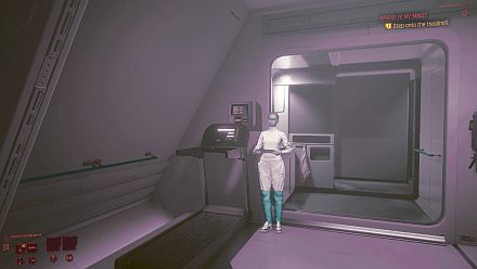 Après les tests, quittez la pièce au réveil. Allez au bout de la salle et interagissez avec la personne assise. Faites plus de tests.
