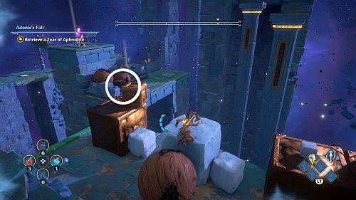 Continuez à travers les rafales de vent pour atteindre un rebord abritant la larme d’Aphrodite que nous recherchons. Pour continuer, sautez à travers l’espace à gauche pour atteindre la zone de puzzle suivante.