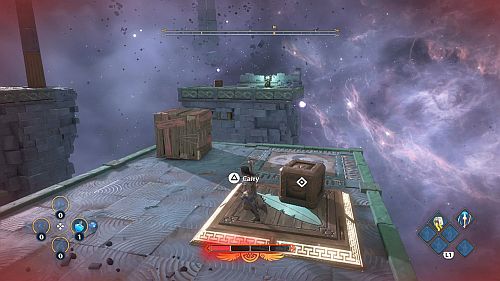 Après avoir passé les deux caisses, vous devez atteindre le rebord suivant. D’en haut, attrapez l’une des caisses et transportez-la jusqu’à la prochaine brèche du chemin. Sautez de l’autre côté. Retournez-vous et attrapez cette caisse et placez-vous sur la dalle de pression (plume) à proximité pour activer un ensemble de rafales de vent.