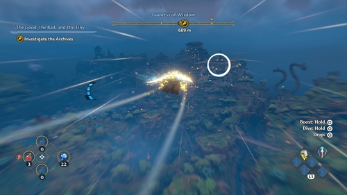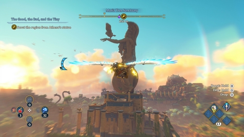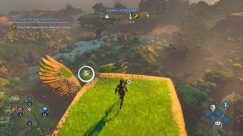Notre objectif initial ici est de localiser la statue géante d’Athéna tenant le bouclier et l’oiseau au centre de la zone (vous ne pouvez pas le manquer!). En arrivant à la statue, montez à la tête de la statue – nous pouvons également nous arrêter et grimper jusqu’à l’oiseau pour une ambroisie au fur et à mesure. Pour compléter l’objectif de reconnaissance, placez-vous au sommet de la tête de la statue.